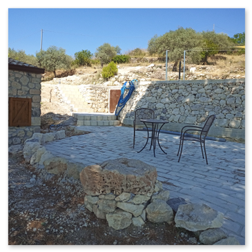 Jedes Haus verfügt über großzügige Terrassen mit Sitz- und Essplätzen. Naturstein, Olivenbäume und stimmungsvolle Beleuchtung sorgen für Abende unter freiem Himmel.