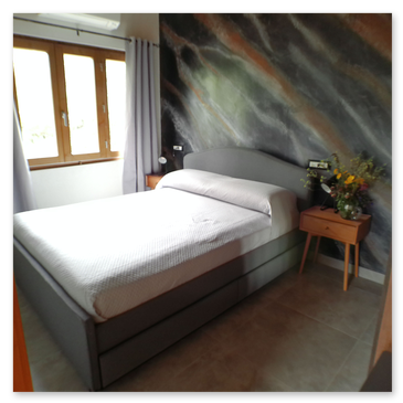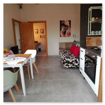 - Küche: 2-Flammen-Kochfeld, Kühlschrank mit Gefrierfach, Wasserkocher, Mokka, Töpfe, Pfannen, Geschirr, Grundgewürze
