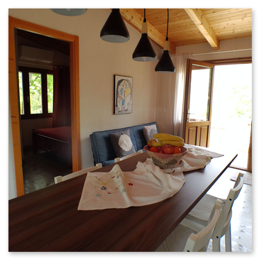 - Wohnraum: Schlafsofa (für 1 Kind), Esstisch, Leselampe